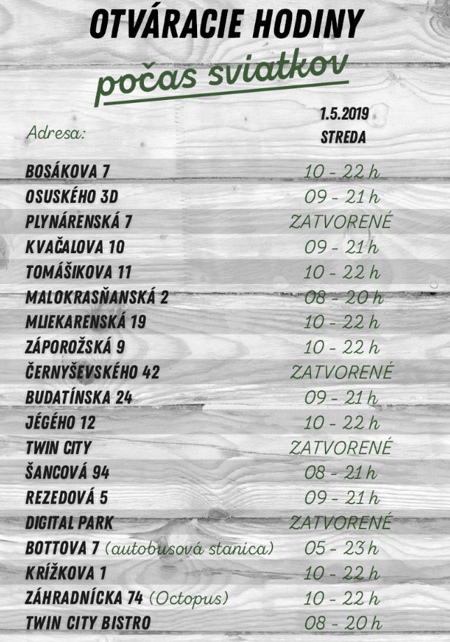 Otvaracie hodiny pocas sviatkov 2019. Maybe you would like to learn more about one of these? We did not find results for: